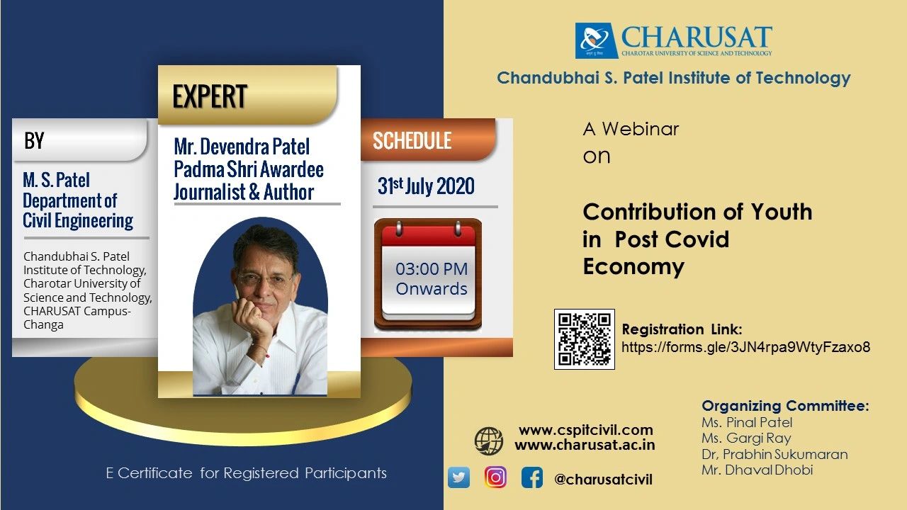 A free of cost webinar on " Contribution of Youth in Post Covid Economy" is organized by M.S.Patel Department of Civil Engg, CSPIT, CHARUSAT, Changa.
