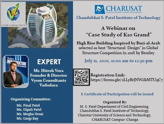 A free of cost webinar on "Case Study of K10 Grand" is organized by M.S.Patel Department of Civil Engineering, CSPIT, CHARUSAT, Gujarat