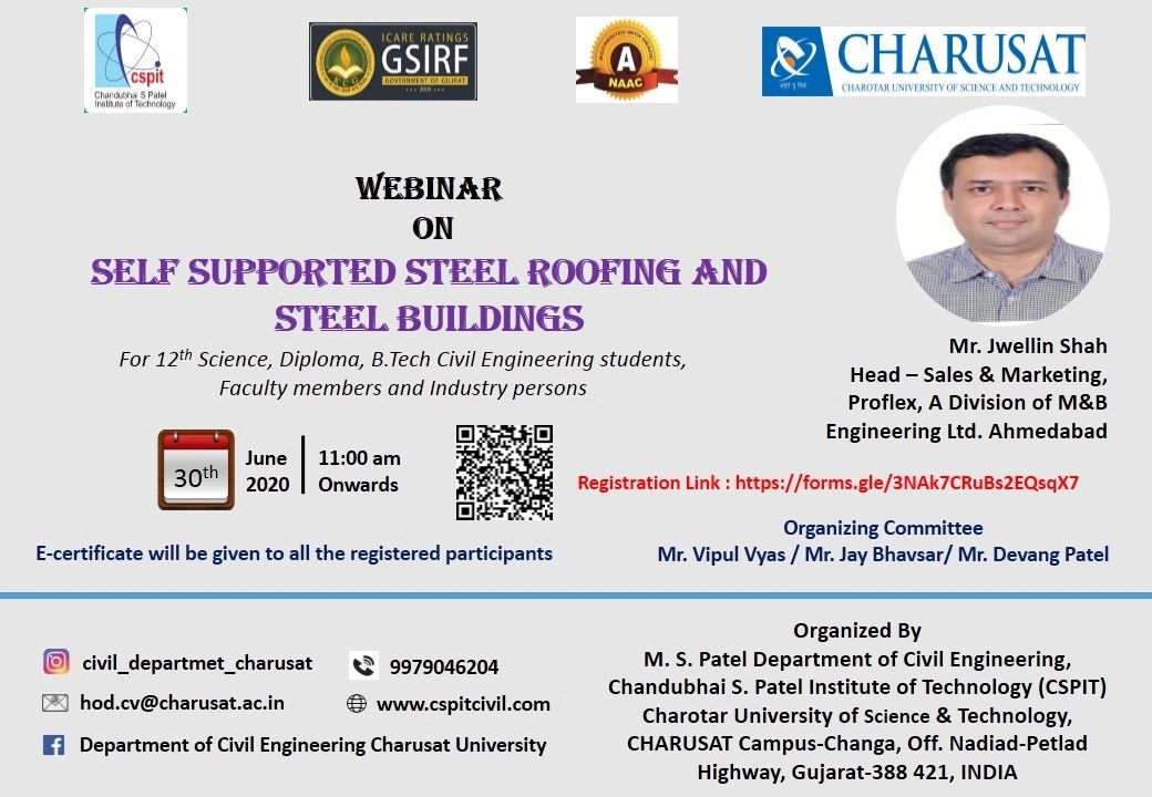 A free of cost webinar on " Contribution of Youth in Post Covid Economy" is organized by M.S.Patel Department of Civil Engg, CSPIT, CHARUSAT, Changa.